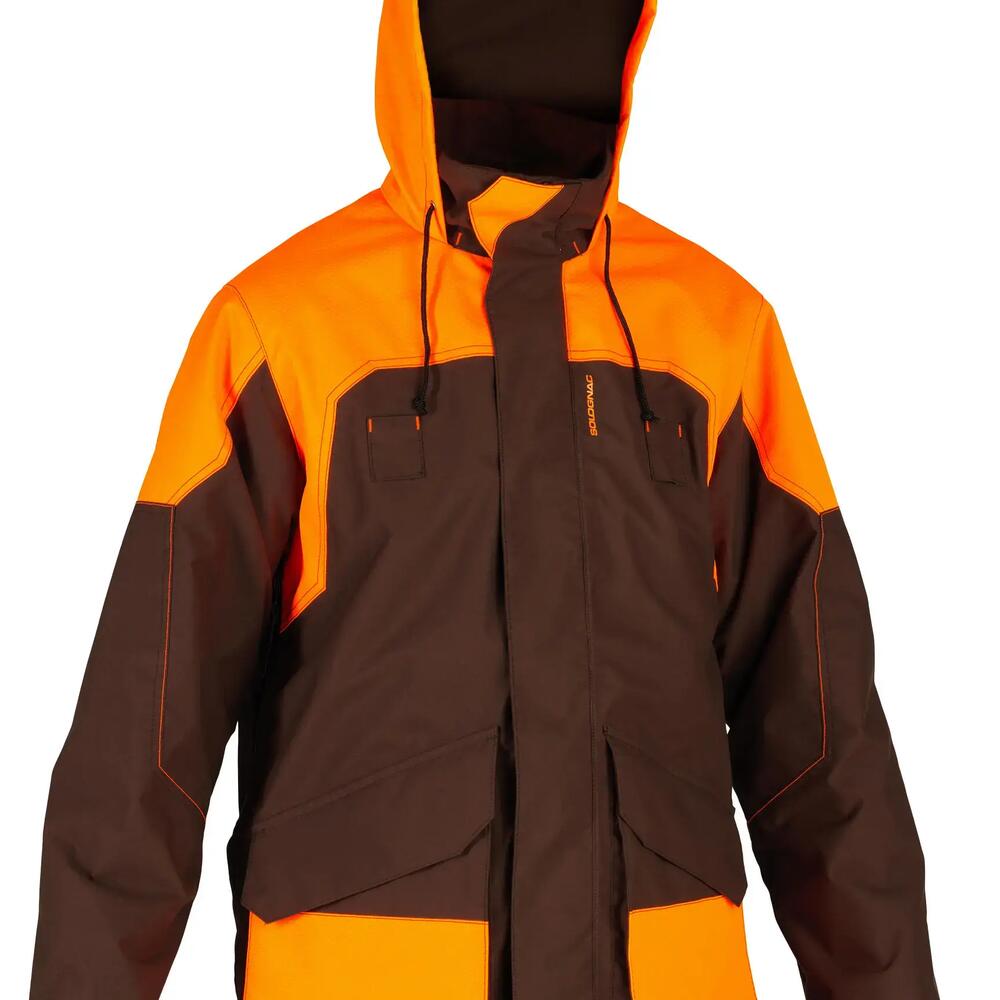 Nuestros ingenieros han desarrollado esta chaqueta para la caza menor en el bosque con tiempo lluvioso, con piezas naranja fluorescente para mayor seguridad.